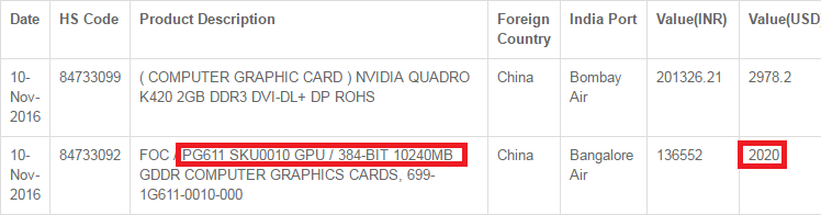 returning to the revelations of Indian customs database, we should mention the appearance of records on imports couple curious cards. PG611 Index (1G611) clearly alludes to the new products belonging to the family of products based on the "big Pascal" - GPU GP102, which lies at the heart of NVIDIA Titan X flagship graphics card , combines a 384-bit bus and 12 GB. memory type GDDR5X.