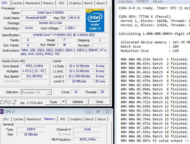 The CPU Core i7-6950X (Broadwell-E) has all ten cores enabled and Hyper-Threading, frequency reached (4.79 GHz) . Calculation of the number "pi" with up to 1 billion. Decimals in this configuration is performed for 8,987 seconds. .