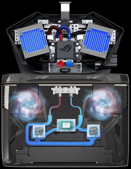 Asus unveiled its highest performing gaming notebook line with the Republic of Gamers 18-inch display and with two discrete graphics cards, called ROG GX800. A unique feature is the use of new items in its liquid cooling system that allows overclocking the processor and two graphics cards.
