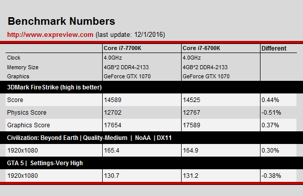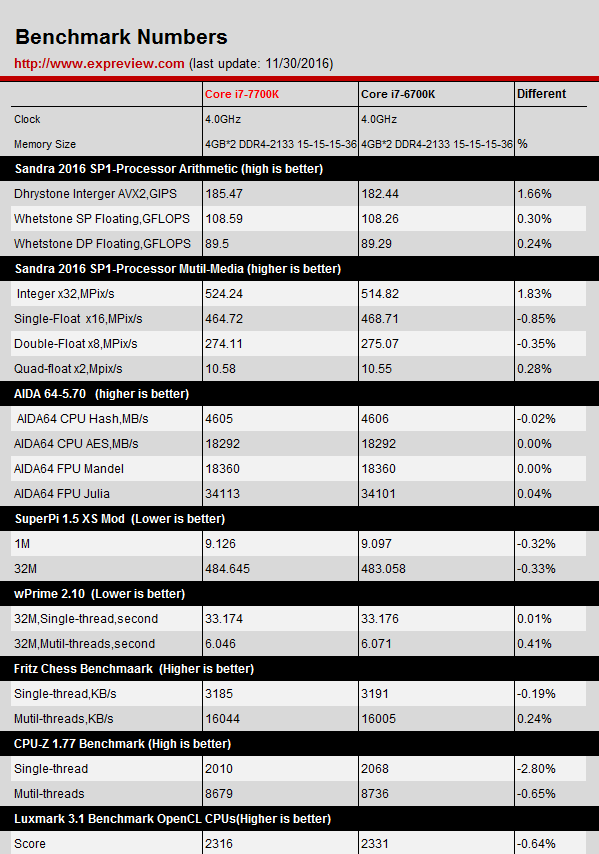 Here are test results of Processor Core i7-7700K and Core i7-6700K at the same frequency of 4.0 GHz .