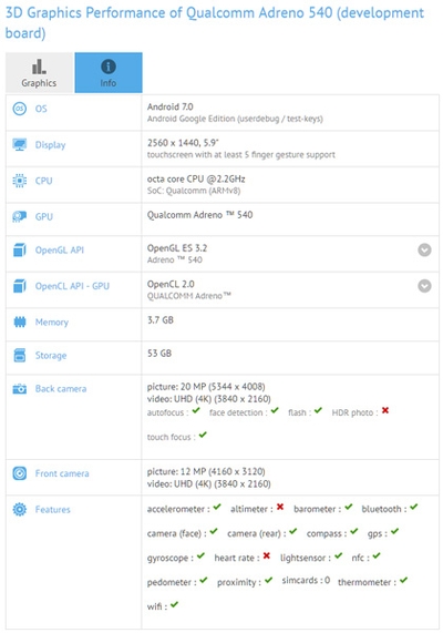 GFXBench tested a prototype on the base of Qualcomm Snapdragon 835 is equipped with a 5.9-inch display with a resolution of 2560x1440 pixels, 4 GB of RAM and 64 GB of internal memory and two cameras: a 20-megapixel main and a 12-megapixel main. It works under the control of the mobile OS Android 7.0 Nougat. The smartphone is endowed with the support of NFC, GPS, Wi-Fi and Bluetooth.