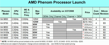 Phenom X4 9650 (2.3 GHz) was noted twice ? AMD reported , that this model simultaneously with the 95- watt version phenom X4 9750 (2.4 GHz) at the given moment is delivered only to OEM- channels. The 125- watt version phenom X4 9750 (2.4 GHz) is supplied only in retail.