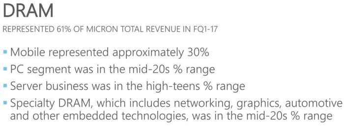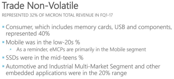Solid-state memory formed 32% of total revenues Micron in the previous three months.  Accordingly, the memory SSDs trampled near 15% Micron's revenue, but the car segment and embedded solutions boast a stable 20%.