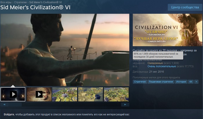 User rating Civilization VI began to approach the red zone (2016-12-29)
