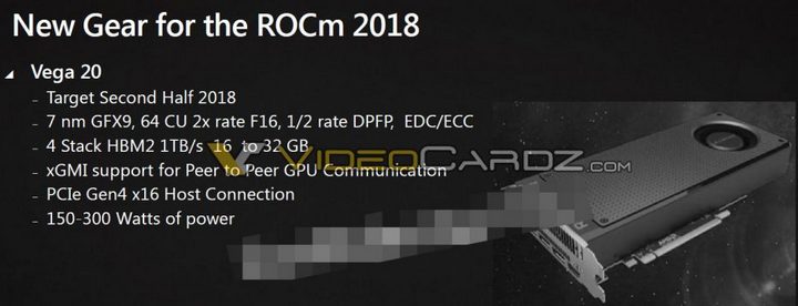 The second published slide reveals details about  Vega graphics processor 20. The output of the GPU is slated for the second half of 2018, it will be carried out on a 7-nm technology standards, and will also have a computing unit 64.  Note here that will significantly increase the computing power in the double-precision operations, and it will be 1/2 of computing power in a single-precision operations, while Vega 10, this ratio is 1/16.  More Vega 20 will receive four HBM2 chips total volume of from 16 to 32 GB with a capacity of 1TB / s.  Finally, we note support for PCI-Express 4.0.