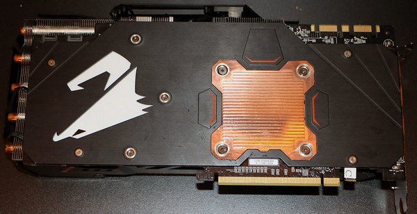 New card looks very similar to the already present on the market, graphics card Gigabyte GeForce GTX 1080 Xtreme Gaming.  Generally, the only noticeable difference between the graphics cards, which immediately catches the eye when you look at it in front - new logos Aorus, who replaced logos Xtreme Gaming on the cooling system.  On the back more noticeable changes where: reinforcing metal plate Aorus received a large logo in the form of an eagle and a copper insert in the GPU, which should theoretically improve the cooling efficiency.