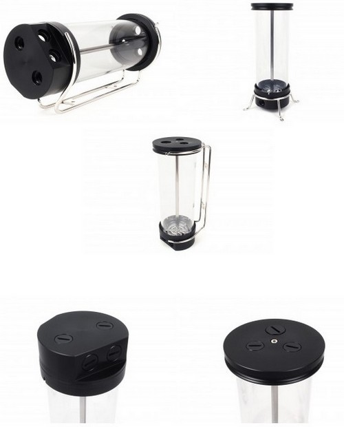 EK-RES X4 250 (R2.0) The reservoir uses a borosilicate glass cylinder, whose height is 250 mm, and a diameter of 80 mm. Total reservoir has eight ports for connecting LSS circuit pipes. The top cover has three apertures new items, two of which have a threaded G1 / 4 "and one - G3 / 8". In turn, the base of the tank has a total of five holes G1 / 4 ": two on the front and lower faces and one - on the back last, incidentally, is perfectly suitable as a drainage hole..