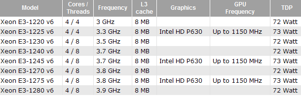 Previously stated that the model Xeon E3-1200 v6 without graphics will consume up to 74 watts, and models with graphics - up to 78 watts. Full list of available models and specifications can be seen in the table above. Related Products :
