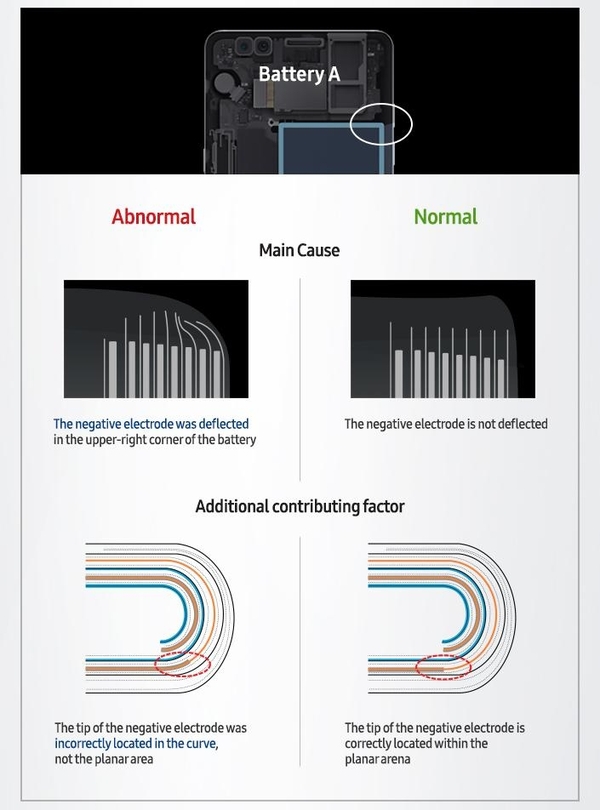 As it turned out, Galaxy Note 7 explosion has two reasons related to the battery of the new smartphone.  In the first case overheating and explosion of smartphones powered battery production design Samsung SDI.  Due to the deformation of the upper corners of the battery electrodes are bent and too close to each other, which, coupled with the thin partitions between the electrodes and cause a short circuit and fire smartphone.