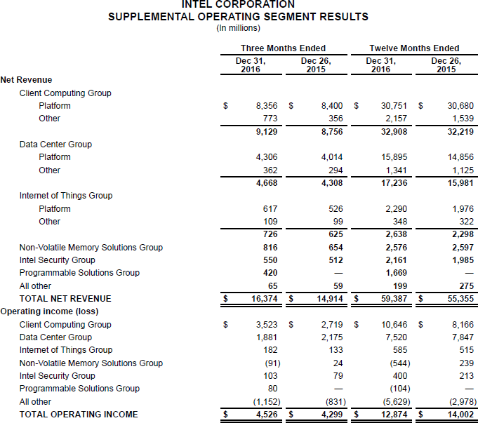 Intel press release, dedicated to the quarterly and annual reports : annual revenue reached a record $ 59.4 ppb, quarter - $ 16.4 ppb Business corporations are still highly dependent on the "client" solutions, because this direction of the annual revenue of $ 32.9 billion. It increased by 2% compared with the year before last.  data centers grew increasingly direction - at 8% a year, but has provided only $ 17.2 billion in revenue..