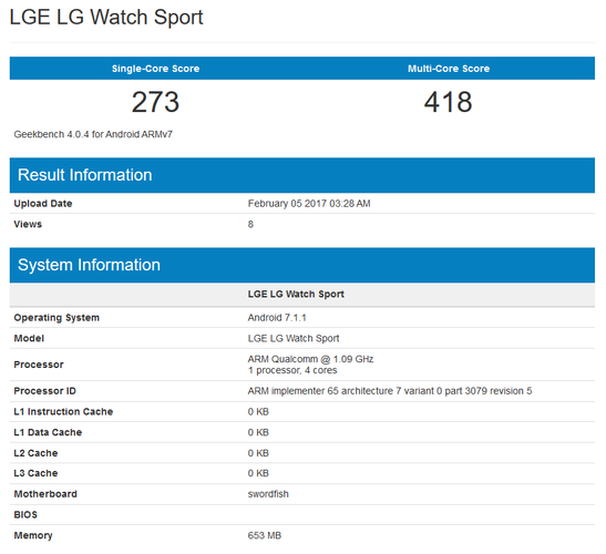 According to sources, in this Thursday or Wednesday, we will see the new smart watches LG Watch Style and the Sport Watch, . In benchmark LG Watch Sport scored 273 points in single-core mode, and 418 points in multi-core. They got 1.09-GHz processor, complemented by 768 MB of RAM. Unfortunately, the processor model is not specified.