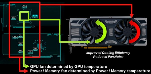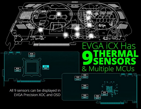 Manufacturer set in different locations of printed circuit boards novelties from nine temperature sensors.  Three sensors monitor the temperature of the memory, five - the state of the elements of the power system, and one - for the GPU temperature.  Data from these sensors are processed by a special microcontroller, and displayed in the application EVGA Precision XOC.  Furthermore, on the side of the cooling system case  , there are three LEDs: for GPU, memory and VRM, that demonstrate the use of color temperature of these elements.  In addition, the new graphics cards equipped with a special safety device that protect users from fire.
