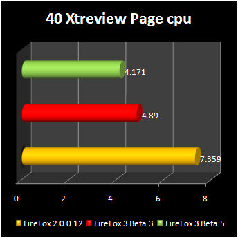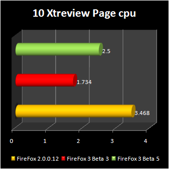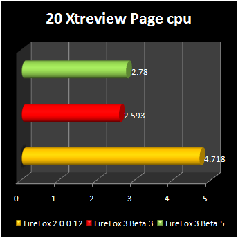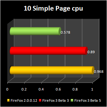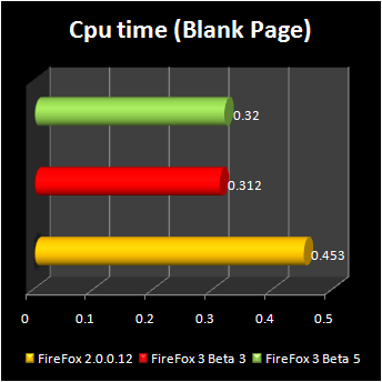 Just like Memory usage CPU time was also improved with FireFox 3 . The new browser use about half CPU power than previous one .The new fire fox beta version (5) improves the CPU usage by almost 20 % in comparison with FireFox 3 beta 3 .This is already a nice progress .The above speak about browser optimization . For example, fire fox 2 was clearly built for a simple HTML page while Fire fox 3 shows better performance with a complex page (average 20) .
