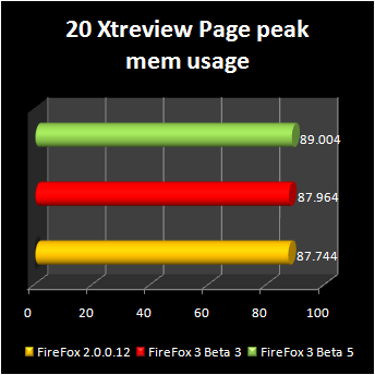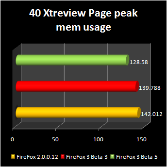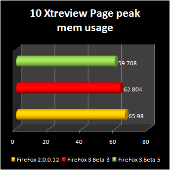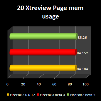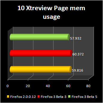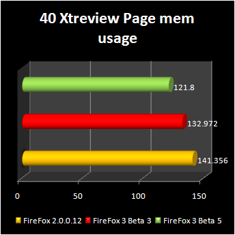 Here it became clear that Mozilla foundation work seriously in memory usage . From the version 2 to the 3 beta 5 there is already 18MB of memory gain . As it was observed in previous test FireFox (third generation) use less memory in comparison with FF 2 especially with 20-40 + . This picture was improved with the new version (beta 5) witch was even more efficient than previous one .