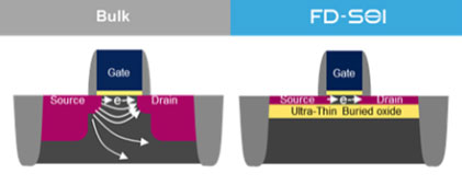 FD-SOI plates - a plate with a thin layer of fully depleted insulator. Due to this layer eliminates the effect of random appearance of floating parasitic charge in the neutral layer under the transistor. Thus, if the thickness of the insulator in the conventional SOI wafer ranges from 50-90 nm, the thickness of the insulator in the FD-SOI wafer is reduced to 5-20 nm. For the FD-SOI is sometimes referred to as ultra-thin SOI.