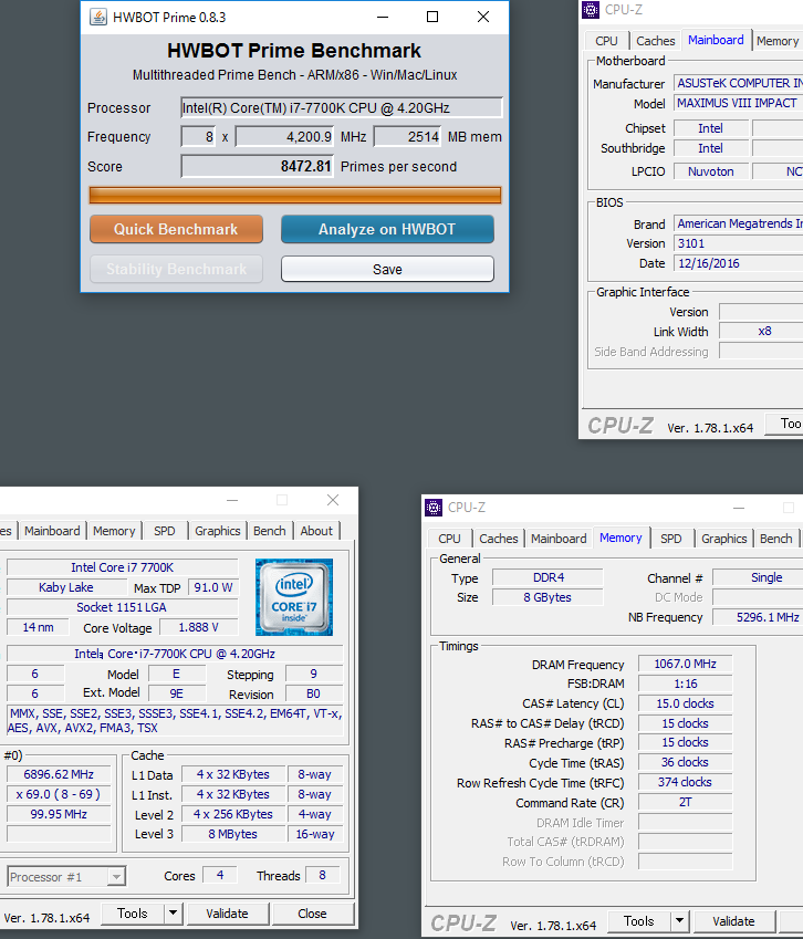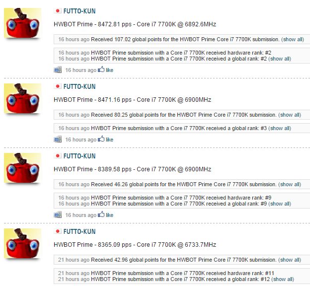 Japanese enthusiast futto-kun, after several attempts to climb from 12th to 2nd place in the world ranking HWBot Prime realized that a successful combination of the parameters may not be associated with the maximum speed of the processor. At first he tried to rise above the ninth place to overclock the processor Core i7-7700K to 6900 MHz with the help of liquid nitrogen, but the silver in HWBot Prime brought him CPU frequency 6893 MHz, and the single-channel memory mode .