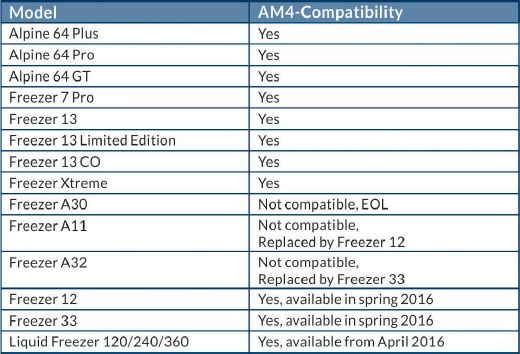 Arctic update document concerning the compatibility of the cooling systems with Socket AM4.  Arctic Freezer A30, which is taken out of production is not  compatible with the new platform's successor.