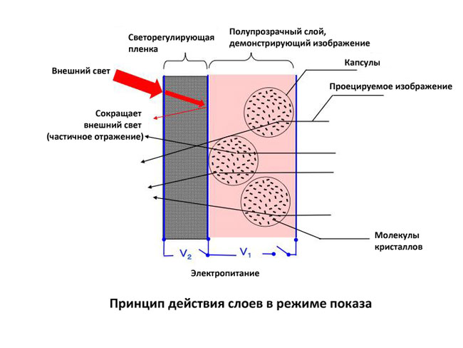 the command to the film, turning it into a light reflection mode and, accordingly, the projection display. In projection mode, contrast ratio is 150: 1.