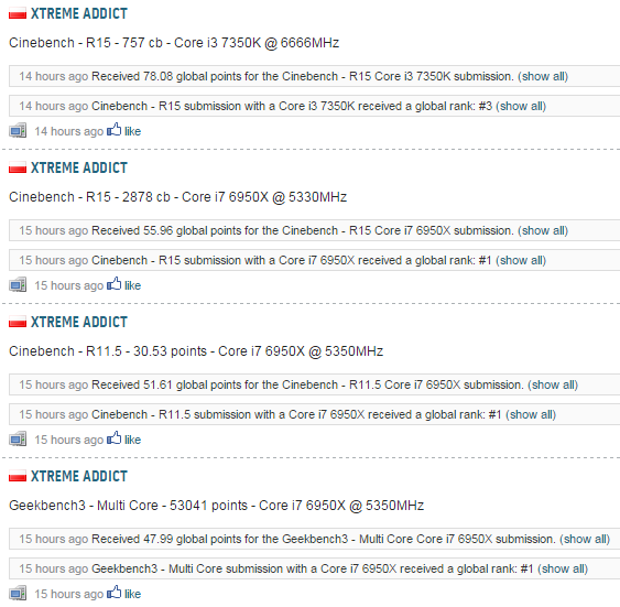 Enthusiast left in third place with a score of Cinebench R15 757 points, which was reached by overclocked to 6666 MHz CPU Core i3-7350K.