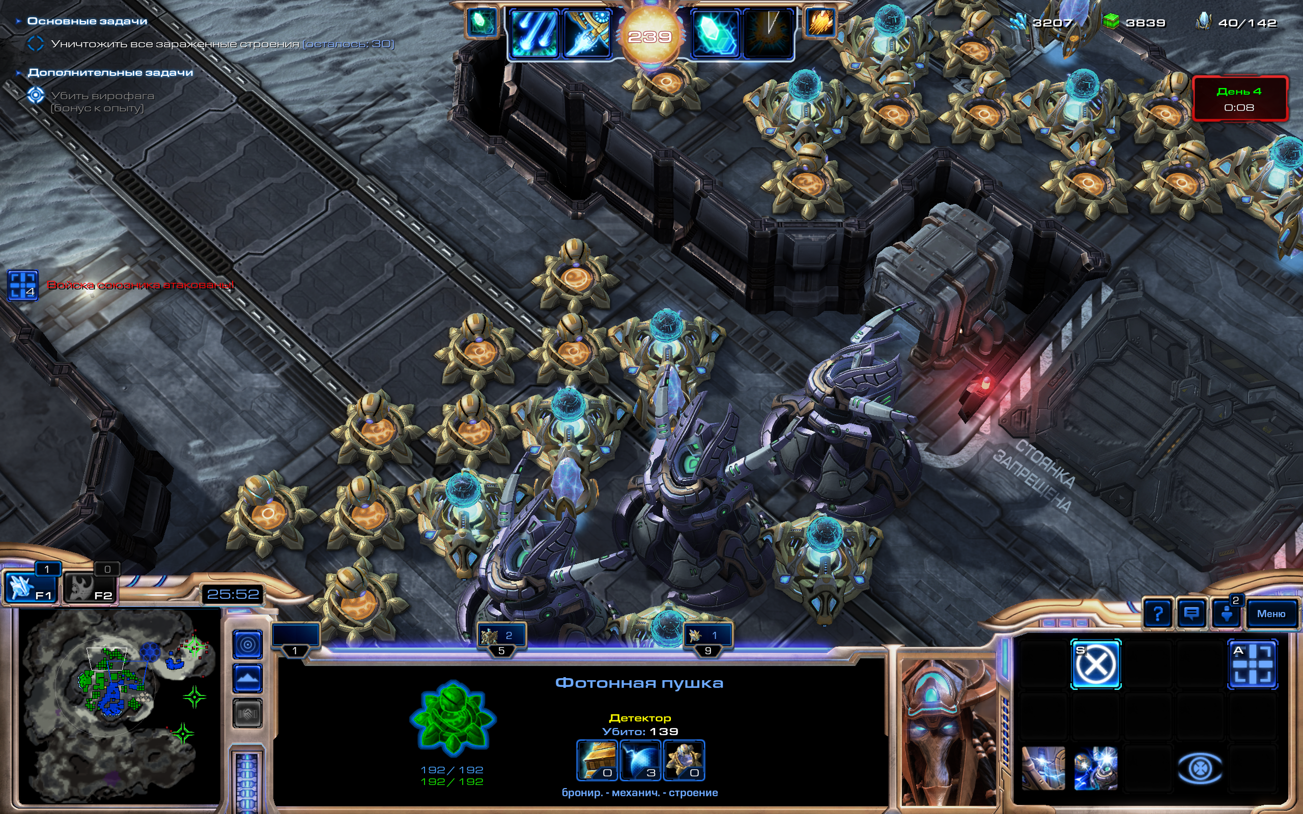 As in the original mission of WoL, the gameplay of the "Dead in the Night" is divided into two phases: night and day.  Players need to quickly build a defense and restrain the nightly onslaughts of those infected, creeping out from under the ground.  As soon as the day begins, the infected are no longer a threat, and all pockets of the epidemic can be safely burned.  The daily cycle on the planet is very short, so the night / day phases last only a few minutes and often take turns.