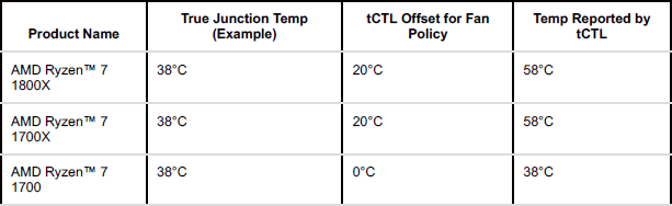 AMD also calls for the correct interpretation of the readings of the temperature sensor of the Ryzen 7 processors. The fact is that in the models with the "X" in the title (Ryzen 7 1700X and Ryzen 7 1800X), a built-in temperature sensor initially contains a delta of 20 degrees Celsius, Control the operation of the fan of a regular cooler, which these models of processors in a number of complete sets are equipped with. The younger Ryzen 7 processor 1700 has no such "temperature markup".