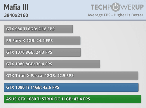 The graphic processor of the tested GeForce GTX 1080 Ti iChill X3 was overclocked in the factory to 1607/1721 MHz, and video memory - 11 408 MHz.  The TDP value for this video card has grown to 280 watts.  Also, it is very likely that the final version will receive higher operating frequencies, so our colleagues decided to increase the clock frequency of the GPU by 50 MHz, to 1657/1771 MHz.  Below are the results of tests in 4K resolution (3840 x 2160 pixels).