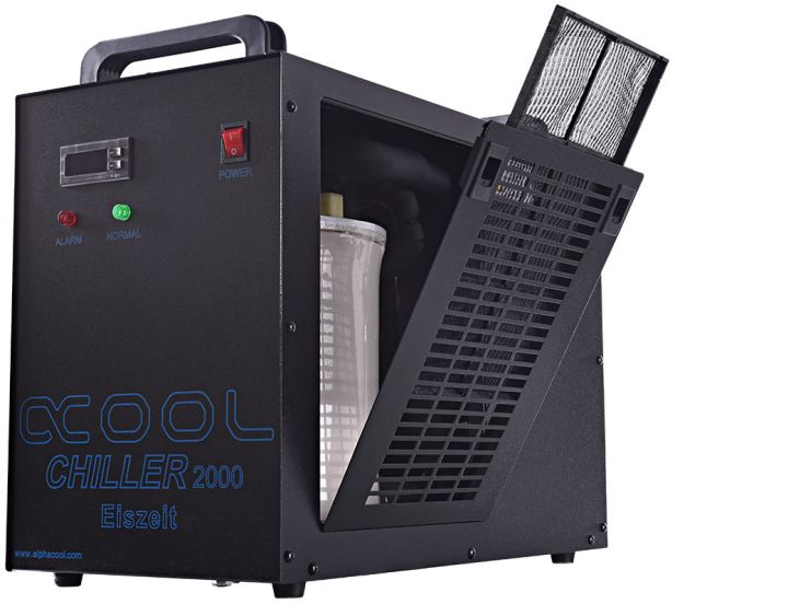 Alphacool company recently released the corresponding component of the cooling system, which is commonly referred to as the chiller.  Its task is to cool the liquid to lower temperatures than conventional liquid-cooling systems allow.  In addition to the refrigeration unit with a rated power of 1500 W, inside the smallest enclosure (560 x 280 x 470 mm) there was a 9-liter reservoir space and a built-in pump capable of pumping up to 10 liters per minute and raising the liquid to a height of 10 meters.