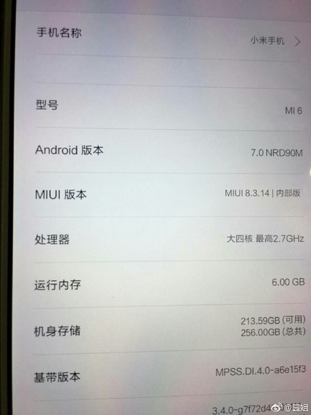 Also, the sources shared photos of two versions  Xiaomi Mi6 Plus with the open section "About the phone".  Judging by the information on the screen, one of the versions of the smartphone has 6 GB of RAM, and the other - 8 GB of RAM.  Both models  Xiaomi Mi6 Plus are equipped with a Qualcomm Snapdragon 835 processor with a clock speed of up to 2.7 GHz and a built-in 256 GB storage.  Smartphones are running the mobile operating system Android 7.0 with a shell MIUI 8.