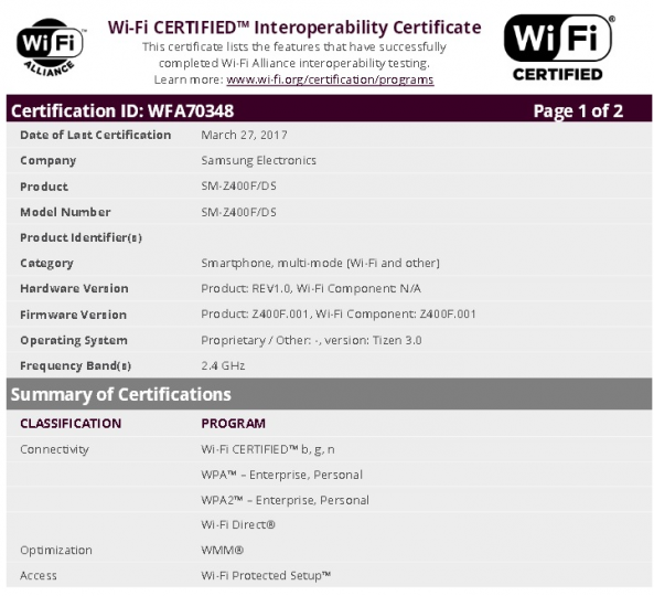 Samsung Z4 on Tizen 3.0 received Wi-Fi Alliance certificate (2017-03-29)