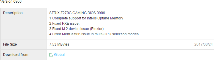 Asus boards and Intel Optane support BIOS updates (2017-04-01)
