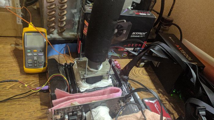The central processor Core i7-6950X was cooled using a cascade-type phase-transition system (minus 70 degrees Celsius), the activity of ten cores and Hyper-Threading was kept in the 4.8-5.0 GHz frequency range.  If we take into account that even under liquid nitrogen such processors rarely overclock above 5.2 GHz, the result is quite decent.
