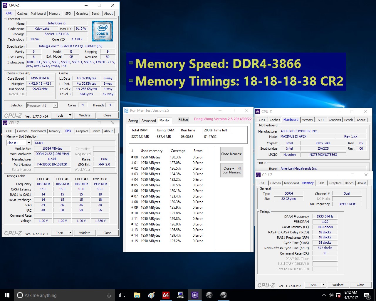 In addition to the sets for the Intel X99 platform, G.Skill also presented a Trident Z RGB DDR4 set of two 16GB modules each aimed at use with the Intel Z270 platform.  This 32 GByte set operates at a frequency of 3866 MHz and the latencies are only CL18-18-18-38, which is also confirmed by the screenshot below.  These modules also work with a voltage of 1.35 V, and support Intel XMP 2.0.