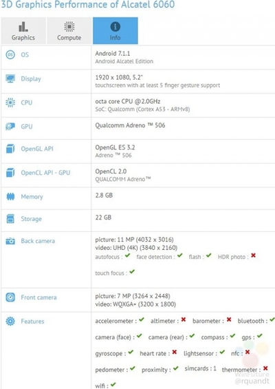 Brand Alcatel, recently introduced the world's first smartphone with two dual cameras called Flash , is preparing to  another smartphone.  Its technical characteristics are found in the database of the benchmark GFXBench.