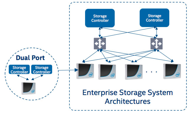 Two-port SSD NVMe allows you to organize high-speed local and network storage arrays.  Each of the two NVMe ports on each drive can be connected to two different controllers, providing minimum latency and maximum data transfer speed.  With local access to arrays, everything is simpler, but when working with networked flash arrays, there is a possibility that the bandwidth of the channels will be missed.