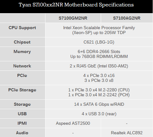 The image of the two boards Tyan S7100xx2NR has a low resolution and therefore little information.  At the same time, there were specifications of motherboards, the data of which are summarized in one table.  Of these, for example, it became known about the Intel C621 chipset, information about which is not yet available.