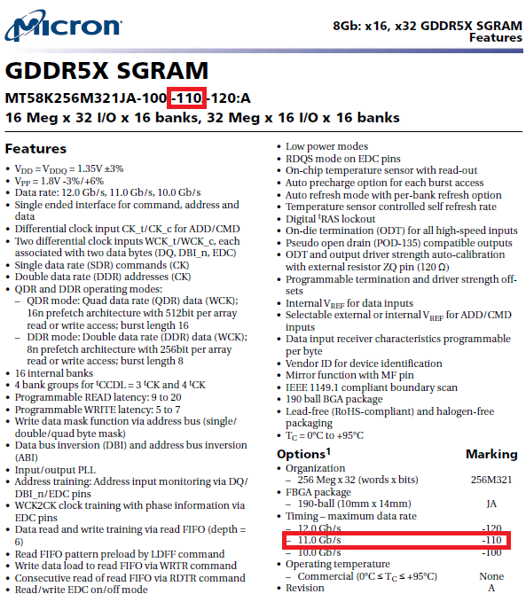 Translated into the language of the technical documentation (see below), this means that the data of the GDDR5X memory chips are designed to operate at 11 GHz QDR.