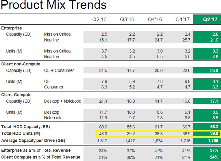 Let's start with the fact that for the first time Seagate decided to hide from the shareholders and investors such a classic indicator as the number of hard drives shipped for the quarter.  It had not previously appeared in press releases, timidly mentioned in the speeches of company representatives before analysts and hiding in the tables of illustrative material.    Simple arithmetic operations make it possible to know that Seagate shipped 36.4 million hard drives in the last quarter.  The slide from the Seagate presentation for the last quarter makes it clear that this is almost as little as in the second calendar quarter of last year (in the table this is the fourth quarter of 2016 fiscal year).