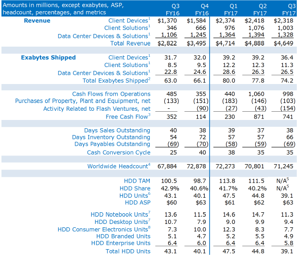 Do not hesitate to talk about the dynamics of hard drives sales volume  on magnetic plates.  In the first calendar quarter of this year, which corresponded to the third quarter of 2017 fiscal year, WDC shipped 39.1 million hard drives.  Of these, 11.3 million hard disks fell into the notebook segment, 9.4 million hard disks into the desktop, and other distributed between server systems, external drives and consumer electronics.