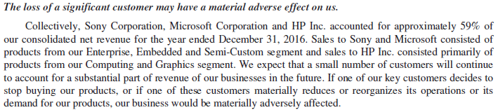 The annual report on Form 10-K forces companies to talk about the factors that make them vulnerable.  Among them there may be not only uncertainty about the competitiveness of their products, but also links to the unreliability of counterparties, and in the case of AMD - also excessive dependence on several large customers.  It's been known for a long time that at this stage of AMD's development the company strongly depends on Microsoft and Sony, who sell game consoles based on "custom" AMD components  .  In the annual report, the company admitted that last year its aggregate revenue by 59% was formed by three major customers: Microsoft, Sony and HP Inc.  The latter in this list came in as a consumer of the Computing and Graphics segment: CPUs and graphics solutions.