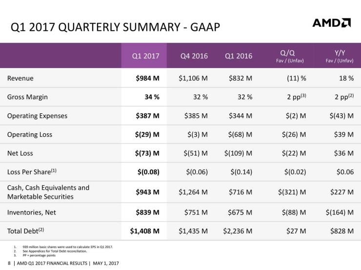 The fact that in a consistent comparison, AMD revenue fell by 11%, can be attributed to seasonal fluctuations in demand. The profit rate for the year increased from 32% to 34%, operating losses decreased from $ 109 to $ 29 million, net losses decreased from $ 109 to $ 73 million. The financial director explained the growth of the profit margin by the appearance in the assortment of AMD products of expensive Ryzen processors.