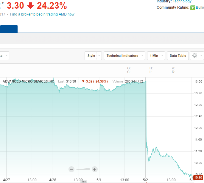 A 10% decline in AMD's stock price, which the market reacted to yesterday's publication of the quarterly report of the company, was just the beginning of a downward movement.  Today, AMD shares have fallen in price by 24.23%, having worked yesterday's news during the first full day of trading.