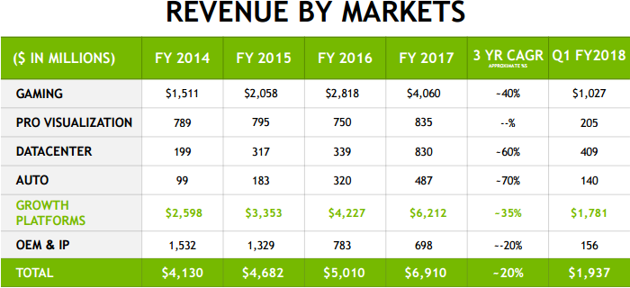 Let's start with the fact that the total revenue of NVIDIA in the last three years grew by an average of 20% per year, and so-called "growth platforms" ensured an increase in revenue by 35% per year on average.  These include segments of gaming solutions, products for data centers, professional graphics accelerators and automotive electronics.  Ready-made PCs and technology licensing, on the contrary, demonstrated a negative dynamics of changes in NVIDIA revenue.
