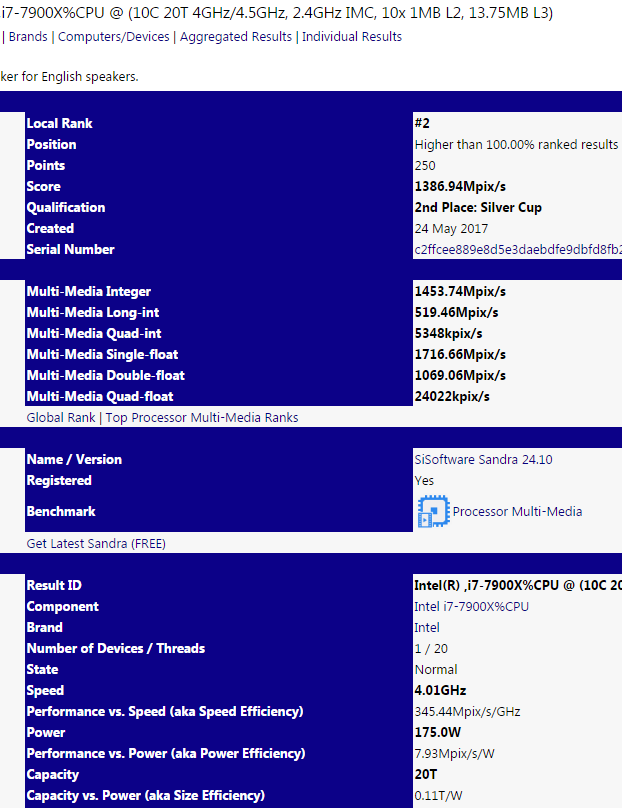 This model is assigned frequencies of 4.0 / 4.5 GHz and 13.75 MB in the third cache level .  Performance in the SiSoftware Sandra Platinum test allows us to state that the Core i7-7900X is 55% faster than the Broadwell-E processor running at 4.5 GHz with the same number of cores.