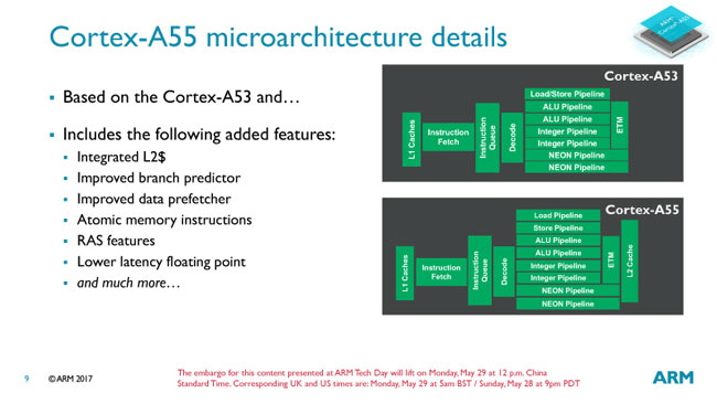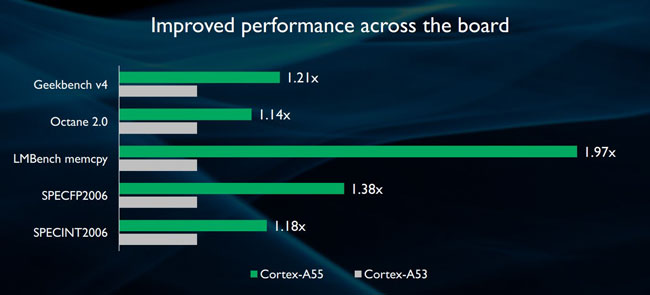 The performance of processing a single stream on the Cortex-A55 cores has increased in comparison with the Cortex-A53 cores and even more - almost twice.  At the same time, the consumption of new kernels decreased by 15%.  Thanks to DynamIQ technology, it was possible to assemble 8 Cortex-A55 cores in one cluster, which would simply "tear" the middle segment, which was previously dominated by a bundle of 4 Cortex-A53 cores.