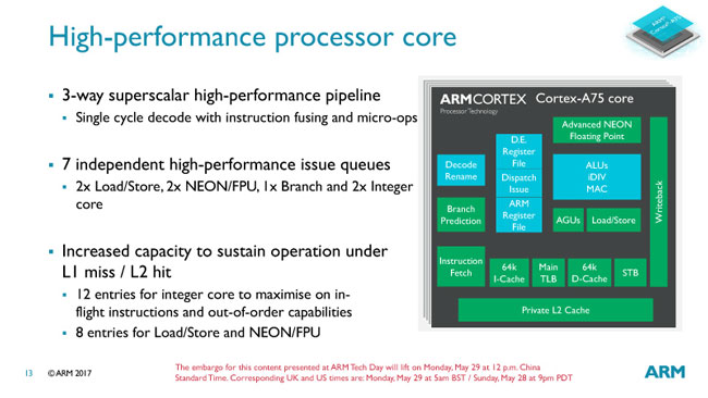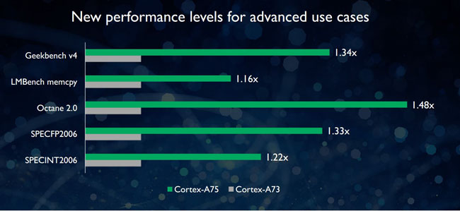 The new high-performance cores Cortex-A75 introduced yesterday are oriented to the whole range of tasks.  There is no more breakdown for mobile and server cores.  A new development will appear in both smartphones and servers.  In comparison with the Cortex-A73 cores, the performance of a single stream on the Cortex-A75 cores has grown to 20% (mobile processors).  When compared with the server cores Cortex-A72, the performance of a single thread increased to 40%.  All this for a single technical process and for an equal clock frequency.