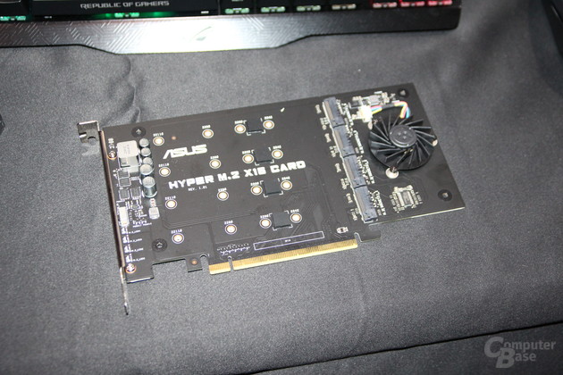 At the ASUS stand at Computex 2017, our German colleagues discovered an interesting PCIe adapter Hyper M.2 x16 Card.  It is a container for four SSDs in the M2 form factor of all permissible sizes, up to a length of 110 mm.  The container is closed with an aluminum casing.  All together is placed in one PC expansion slot.  Also, the board has a fan for cooling the SSD under load, but it can be turned off, for which a switch is provided on the mounting plate.  Four more LEDs are located on the lath of the fastening, signaling the operation of the SSD in the container.