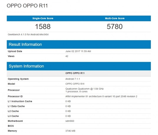 Oppo R11 based on Qualcomm Snapdragon 660 scored in GeekBench 1588 points in the test of one core and 5780 points in multi-core mode.  The benchmark indicates that the eight-core processor with a clock speed of 1.84 GHz complements 4 GB of RAM.  And as a preinstalled operating system declared Android 7.1.1 Nougat.