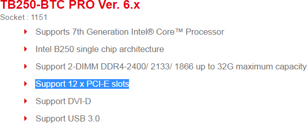x16 slot has a constructively rigid connection with the motherboard. The remaining 11 PCI Express x1 3.0 slots allow connecting video cards to them via special "extenders" on flexible loops.