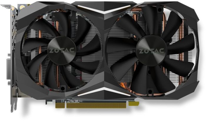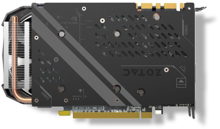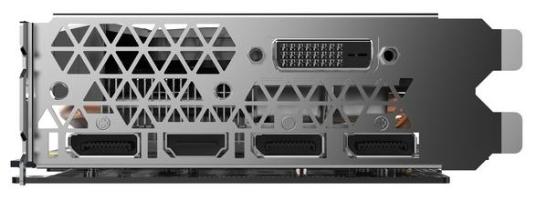 The cooling system uses two different-sized fans (90 mm and 100 mm), five heat pipes with a diameter of 6 mm and an aluminum radiator.  The fans are white, it works continuously.  Black-and-gray range of other design elements is designed to please all the supporters of color harmony, which irritated the passion of ZOTAC yellow.
