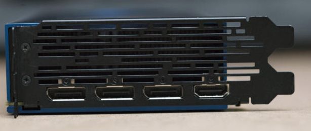 Rear panel Radeon Vega Frontier Edition has original "longitudinal" ventilation slots, three outputs DisplayPort 1.4 and one HDMI 2.0 are located in one row.  Theoretically, this should allow equipping such a video card with a water block, which will reduce the occupied space to one expansion slot.